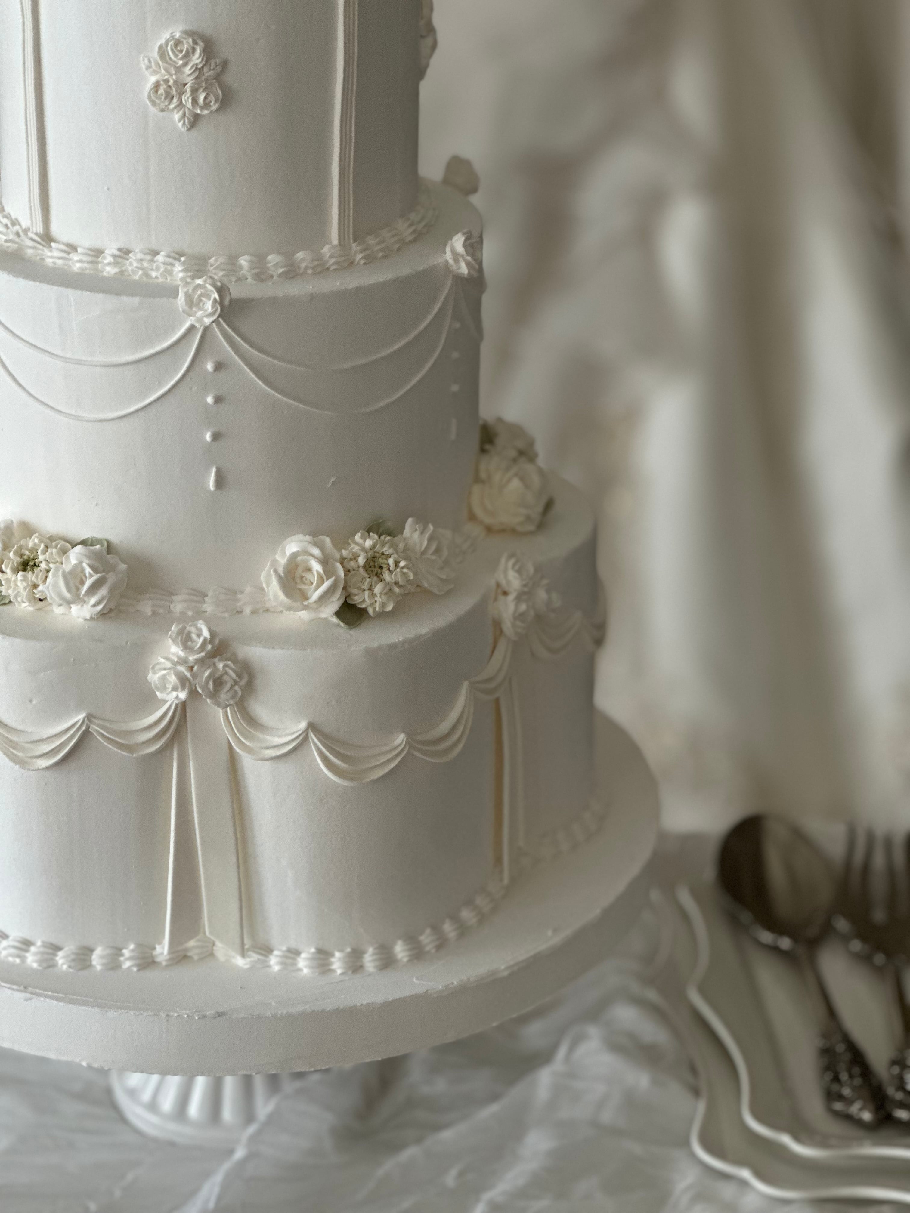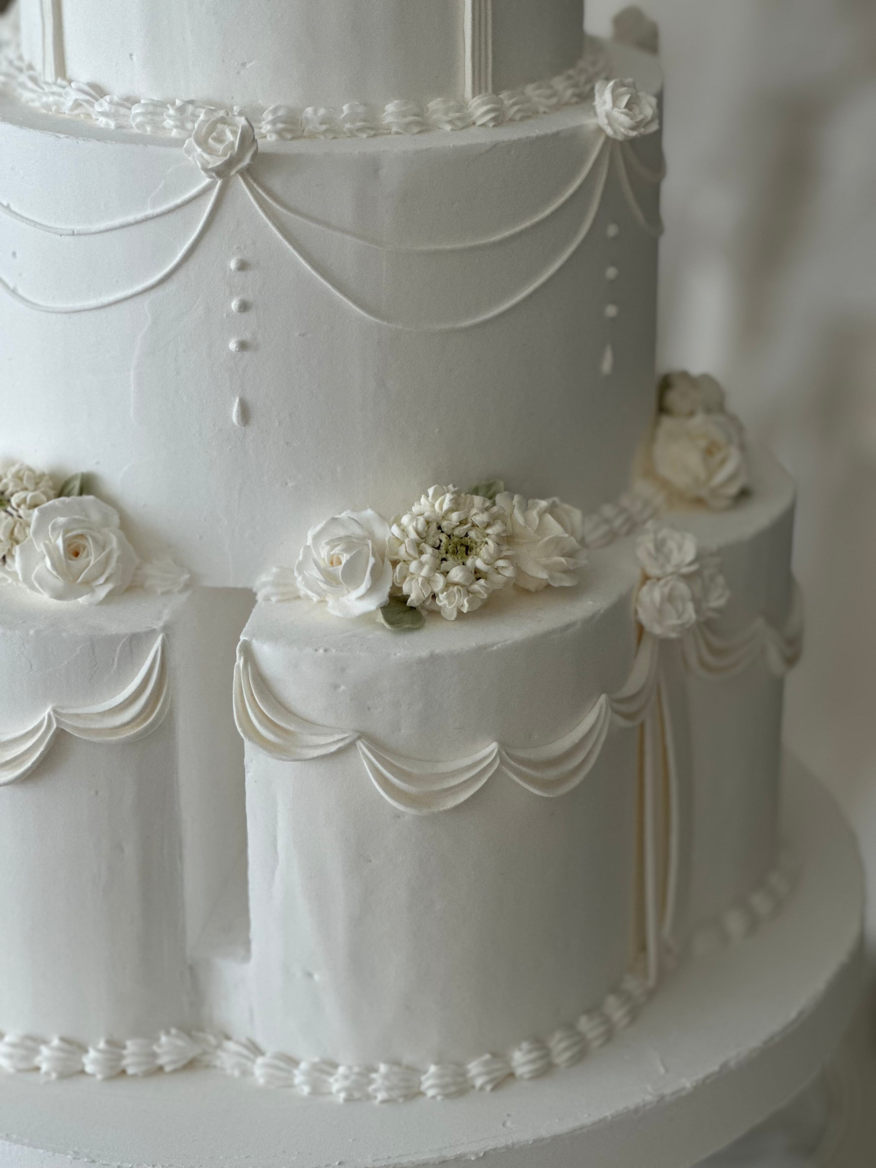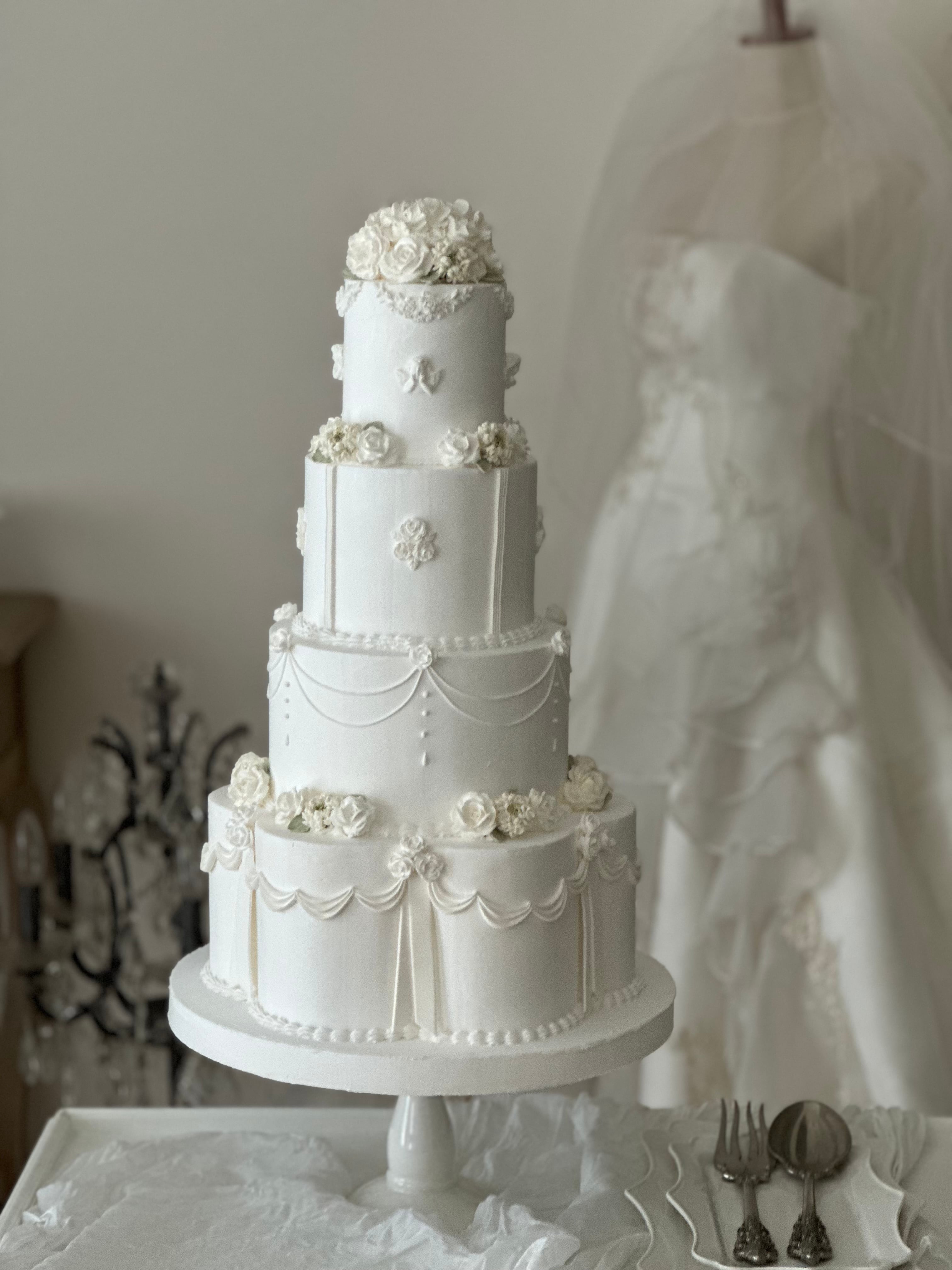 ケーキの基調を彩るタッセルのようなリボン装飾が印象的なデザイン。小さな天使のモチーフや、グリーンをほんのりと含んだオフホワイトの花々が調和し、クラシカルで優美な雰囲気を漂わせます