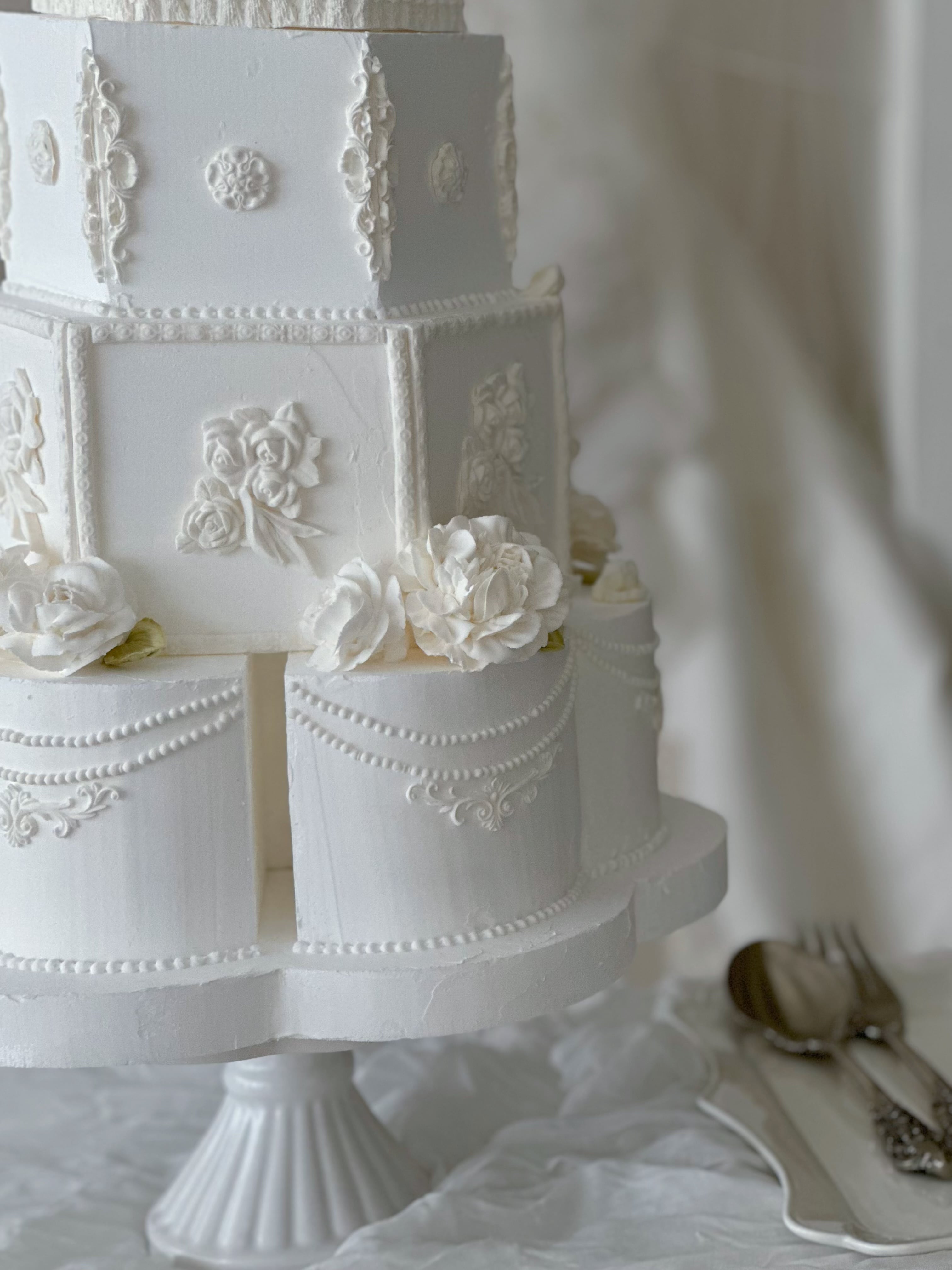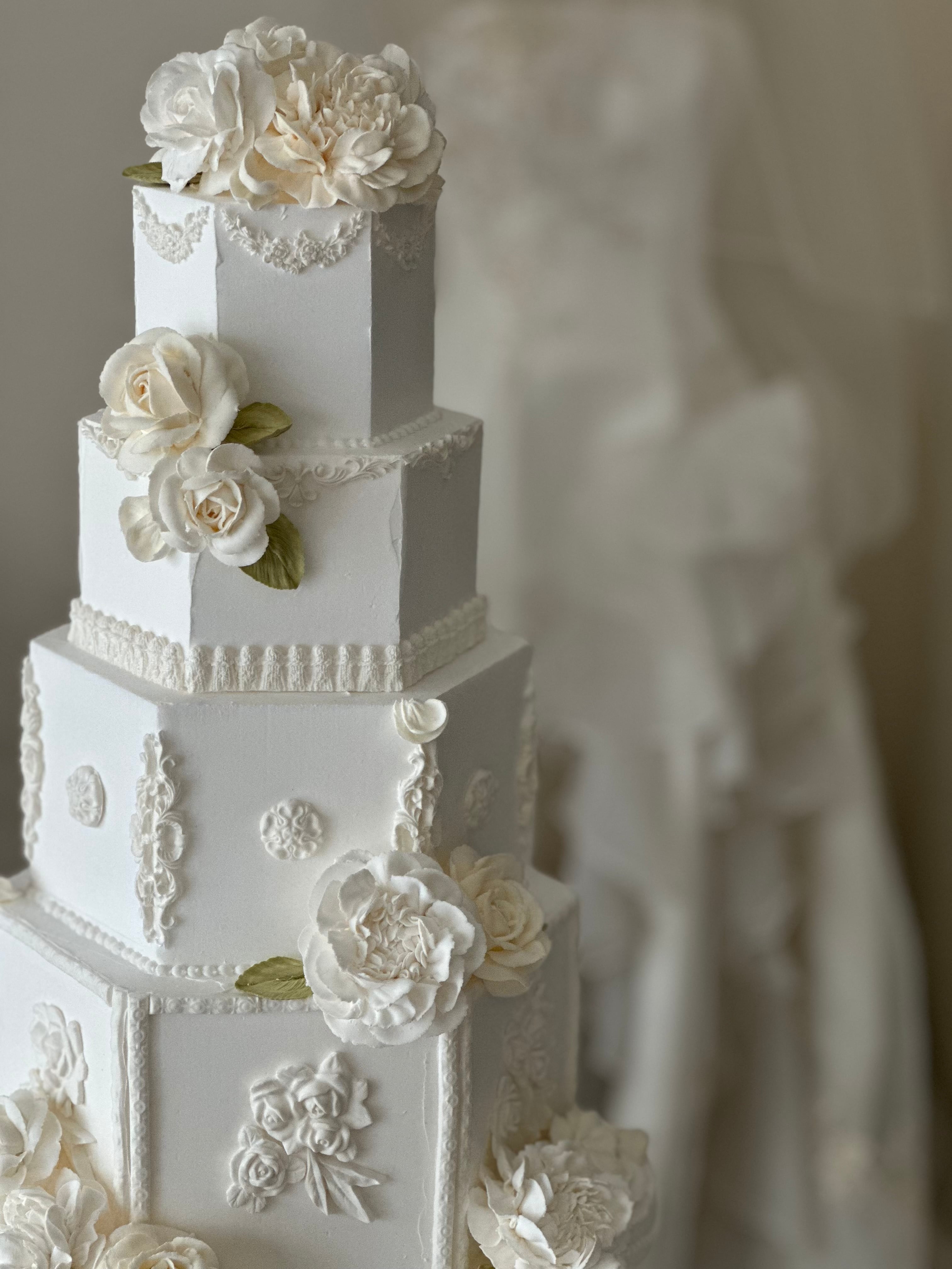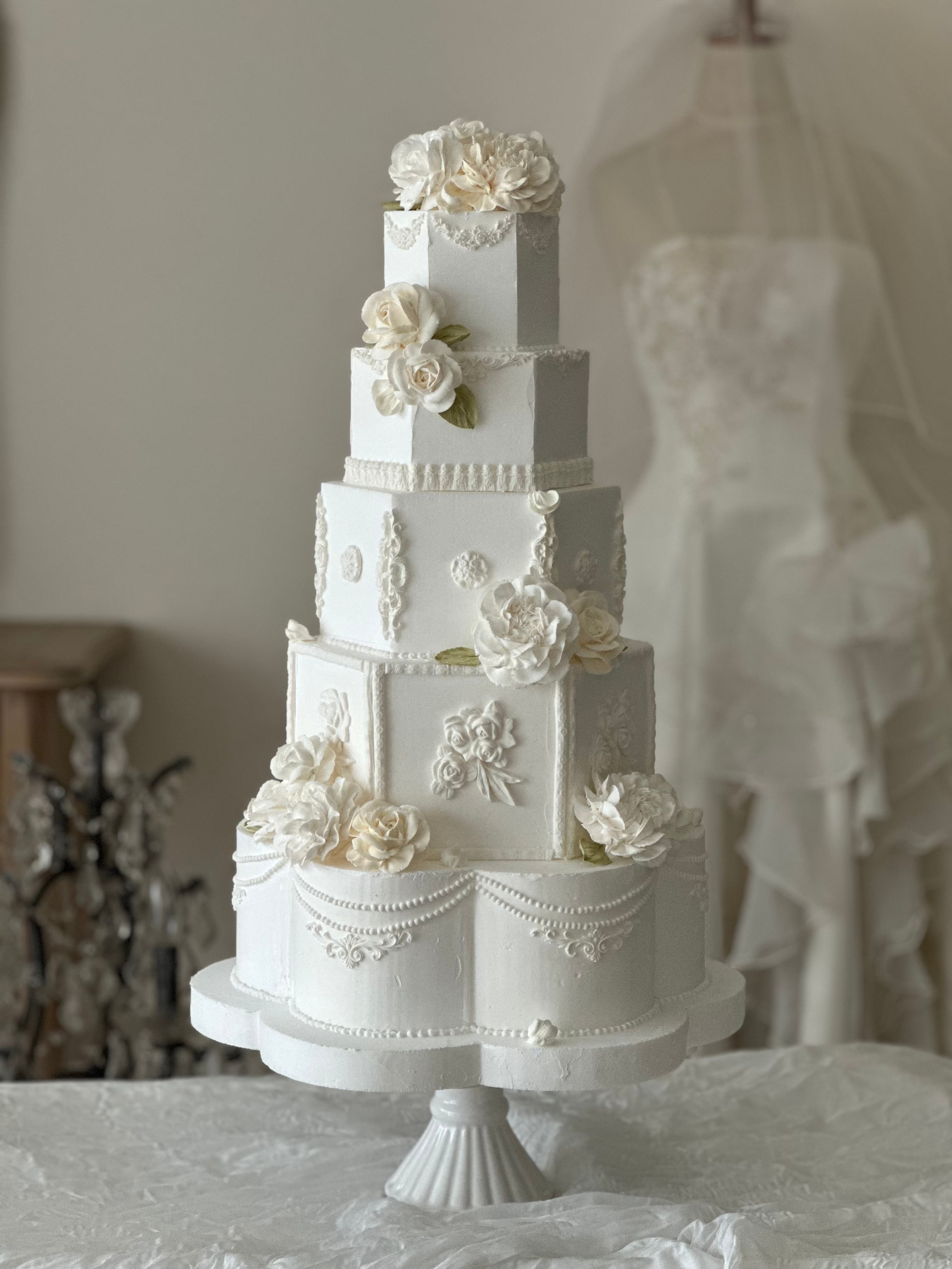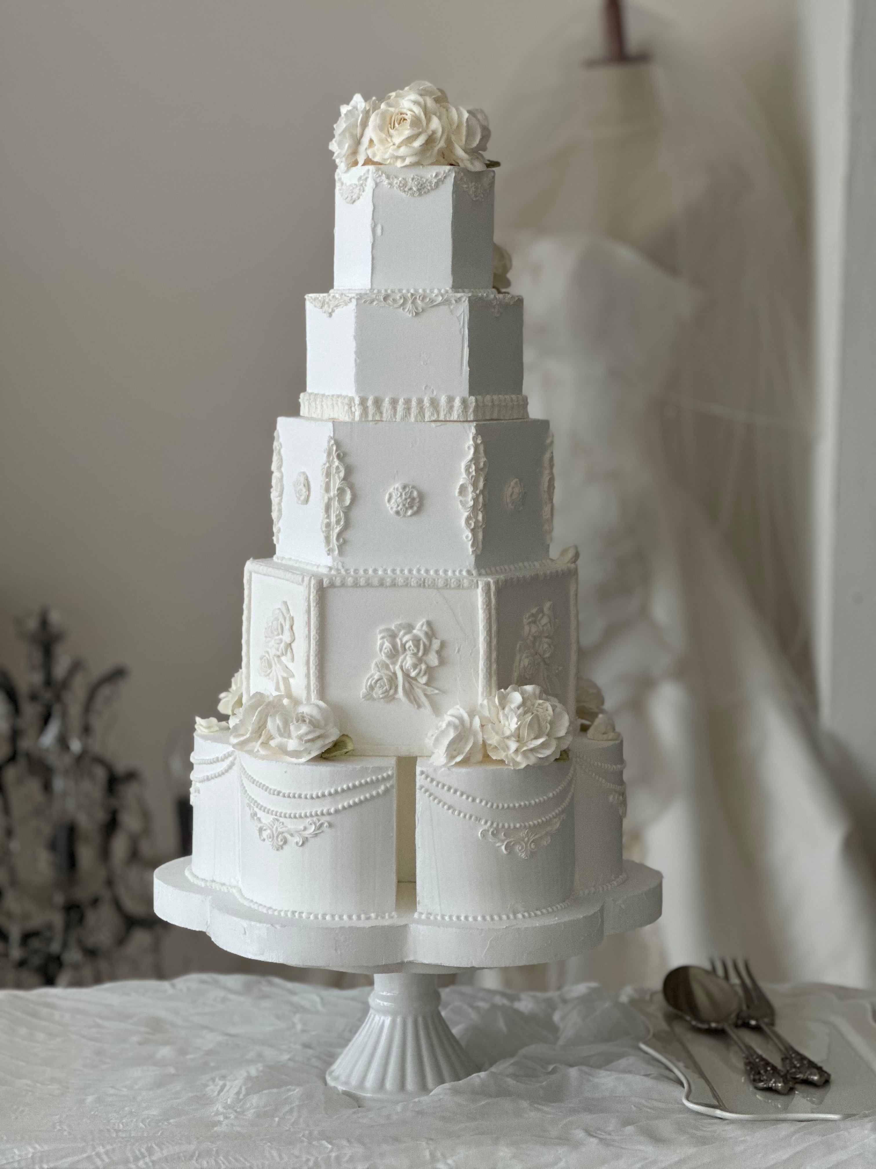柔らかなオフホワイトの花々が咲き誇る、クラシカルな六角形のシルエット。最下段を花形に仕上げた独創的なデザインが、気品と個性を際立たせます